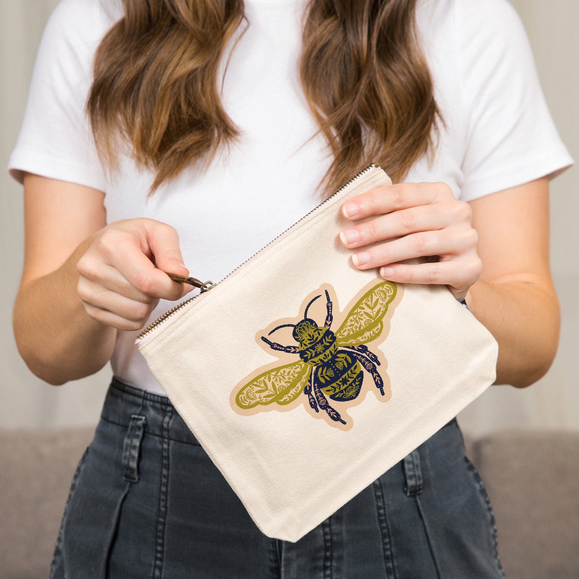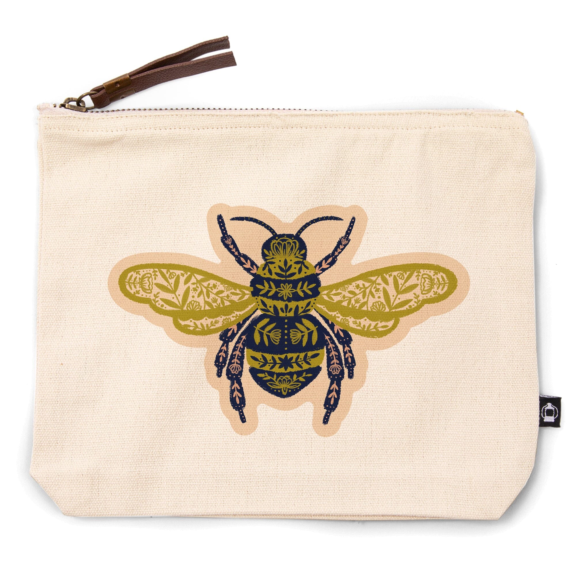 Nature's Beauty Series, Ornate Floral Bee,, Organic Cotton Zipper Pouch, Go Bag