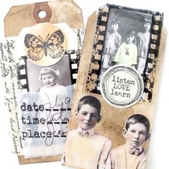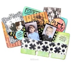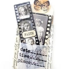 Rubber Stamping Technique - Stamp the film strips on clear acetate with Jet Black Staz On Ink. Let the ink dry for an hour or so to prevent smudging. Cut out the film strips and glue small photos on the back side of the film strip.