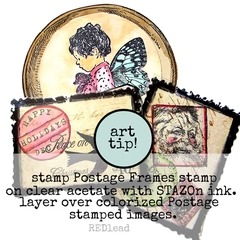 Frame up everything with our Postage Frames and make Faux Postage Stamps the EZPZ way! We stamped the frames on Clear Acetate with Staz On Black Ink, let the ink dry for a few minutes and layer the frame on top of your favorite stamped image or collage sheet. We used a UHU glue stick to adhere the frame to the image - just run a little glue around the edges of you image and layer the frame on top.The size of the Postage Frames is approximate: 2-1/4" x 3-1/4", 1-1/2" x 1-1/2", 1-1/2" x 1-3/4",1-1/4" x 4"