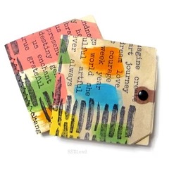 How to make the Painted Stitched Tag Books. Tea Dye manila tags and let the tags dry overnight. Paint swatches of color on the tags. Let the paint dry for a few hours. Using Ranger Jet Black Archival Ink stamp the She Paints stamp on top of the painted tags. Fold the tags in half. Machine or Hand Stitch on the fold to create the Painted Stitched Tag Book.