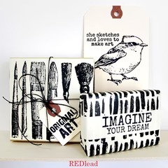 The perfect brush strokes to stamp backgrounds, make gift wrap, greeting cards, and tags with She Paints. Try stamping black on bright papers or bright ink on pastels - either way you are going to love! The size of the rubber stamps are approximate: The paint strokes are 2-1/2" x 3", the word She Paints is 1/2" x 2-1/4". Red Lead rubber stamps are made in the USA of premium quality cling mount red rubber and each stamp is trimmed to size and on a storage card. Black and White Stamped Boxes featured in Somerset Studio Magazine.