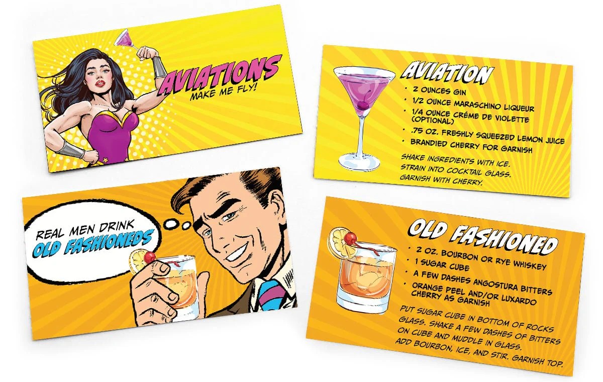 Classic cocktail recipe Tear and Share cards. This matchbook style booklet containing 20 removable recipe note cards is sure to impress. Each card has a pop art illustration with a satirical phrase on the front and a cocktail recipe on the back. Tear one out and let them inspire your next gathering, or just at home to create a lively happy hour.