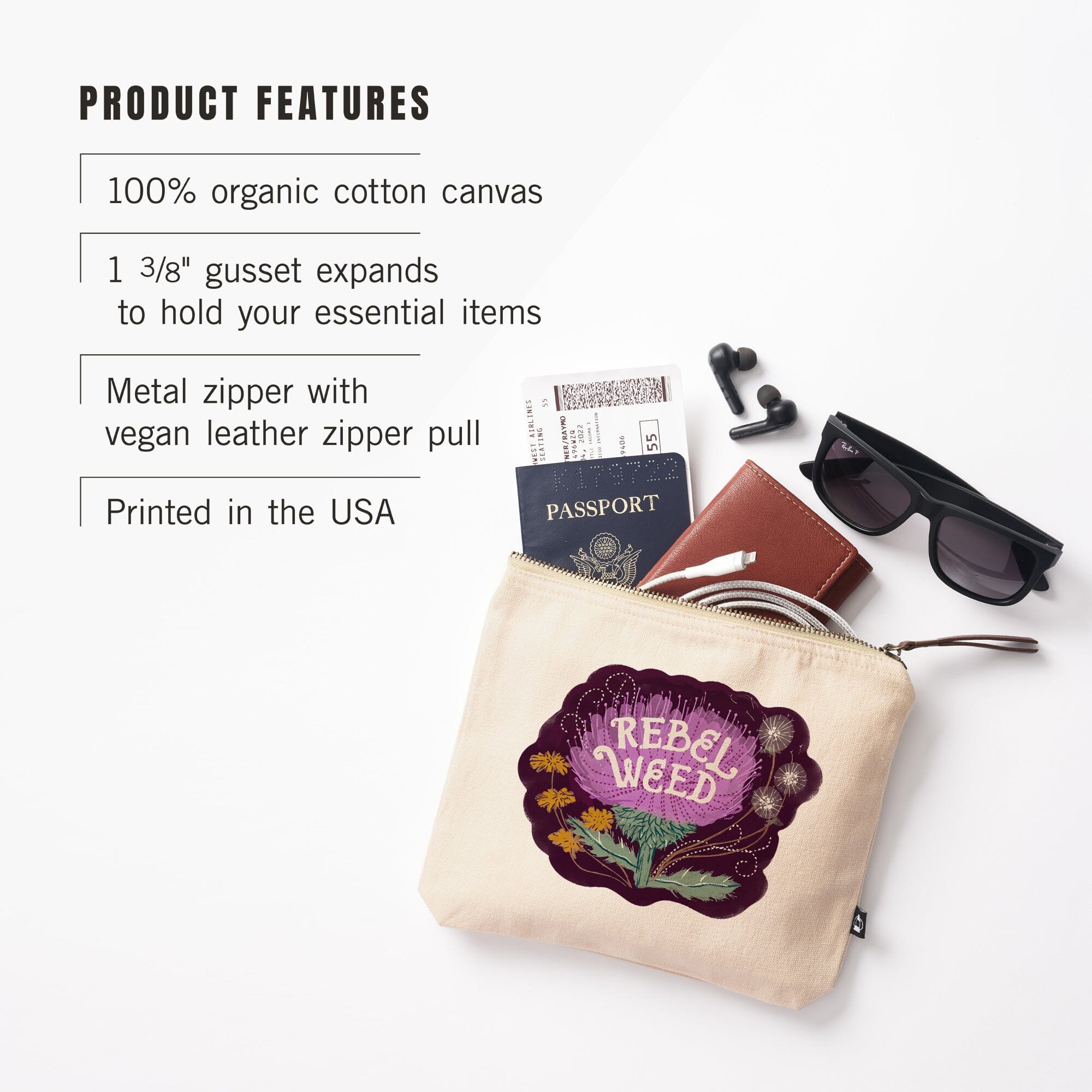 Nature's Beauty Series, Rebel Weed Flowers,, Organic Cotton Zipper Pouch, Go Bag